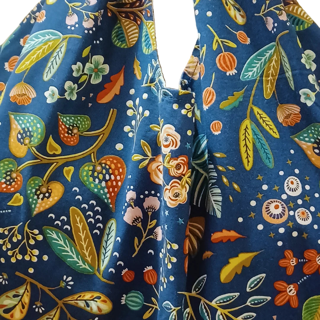 en coton fond bleu avec un décor floral multicolore, doublé coton blanc,